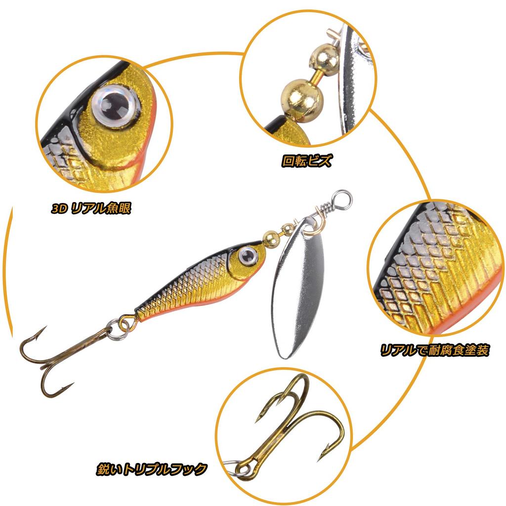 Используется для различных видов форели, включая змееголовов, форель и морскую рыбу. Этот набор блесен-спиннеров отличается высокой универсальностью и простотой использования. (15 приманок весом от 2,2 г до 4,2 г, плюс одна приманка весом 12,3 г) поставляется в 16 различных блеснах, включая лепесток «Индиана», лепесток «Ивовый лист» и лепесток «Колорадо», блесну с хомутом, крыло с хомутом и блесну с хомутом (12,3 г), делая его универсальным для различных ситуаций, от мелководья до дна, в зависимости от течения и глубины. Важная заметка: При использовании вертлюжков застежка-вертлюжок может помочь уменьшить перекручивание лески.