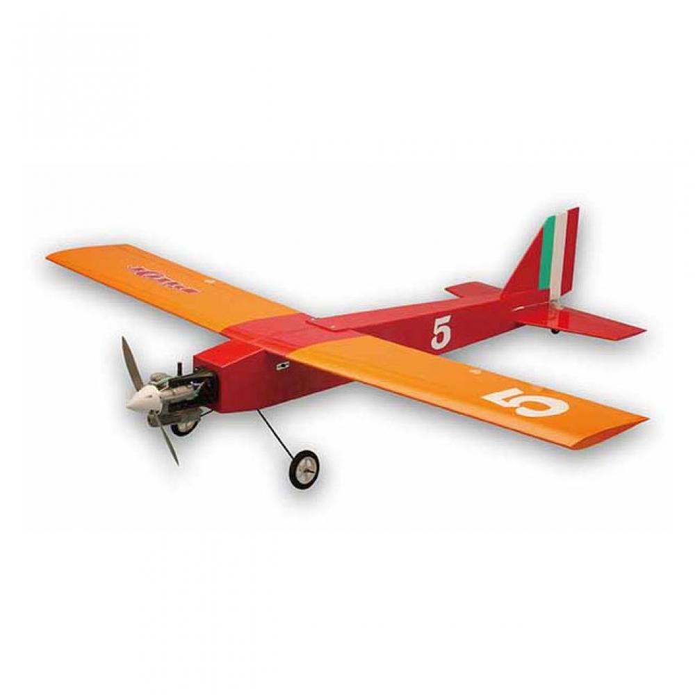 This is an original Japanese 25 class sport aircraft. The thin, fully symmetric main wing with sufficient area and a backward angle provides excellent stability at both high and low speeds. It's an easy-to-fly sports aircraft. Due to its simple structure, modifications such as attaching the cowling or cockpit can also be enjoyed. With three color schemes inspired by pre-WWII cup racers, it is perfect for both solo flights and racing with friends.