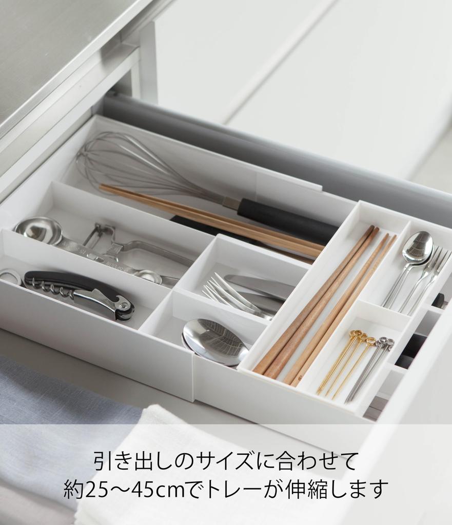 Yamazaki Раздвижной органайзер для столовых приборов W25 x x Раздвижной органайзер для столовых приборов 3384 и поднос, Белый, Прибл.. D24.6-45 H5.7см, Тарелка, Чехол,