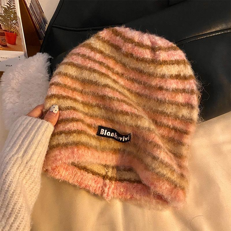 Ретро Полосатая Плюшевая Шапка с Ворсом для Женщин на Осень и Зиму Теплая Универсальная Большой Окружности Головы Подчеркивающая Лицо Маленькая Вязаная Шапка Трендовая