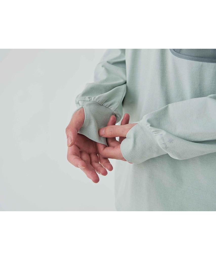 A must-have for anyone who enjoys water activities. Highly recommended for women who are concerned about sunburn. This amphibious long-sleeved T-shirt from the "Water Active" series is suitable for everyday wear as well as water activities during summer outdoor activities. The main fabric is a stretchy material made from 100% recycled polyester, without polyurethane. The yarn's unique gentle kickback allows it to easily move with the body and provide a comfortable fit. Its high crimping properties give it volume, increased elasticity, and resilience, resulting in a firm, resilient yet extremely lightweight garment. It also boasts excellent moisture absorption, quick-drying properties, UV resistance, and chlorine resistance, making it suitable for use in the ocean or pool.