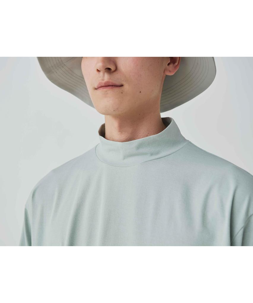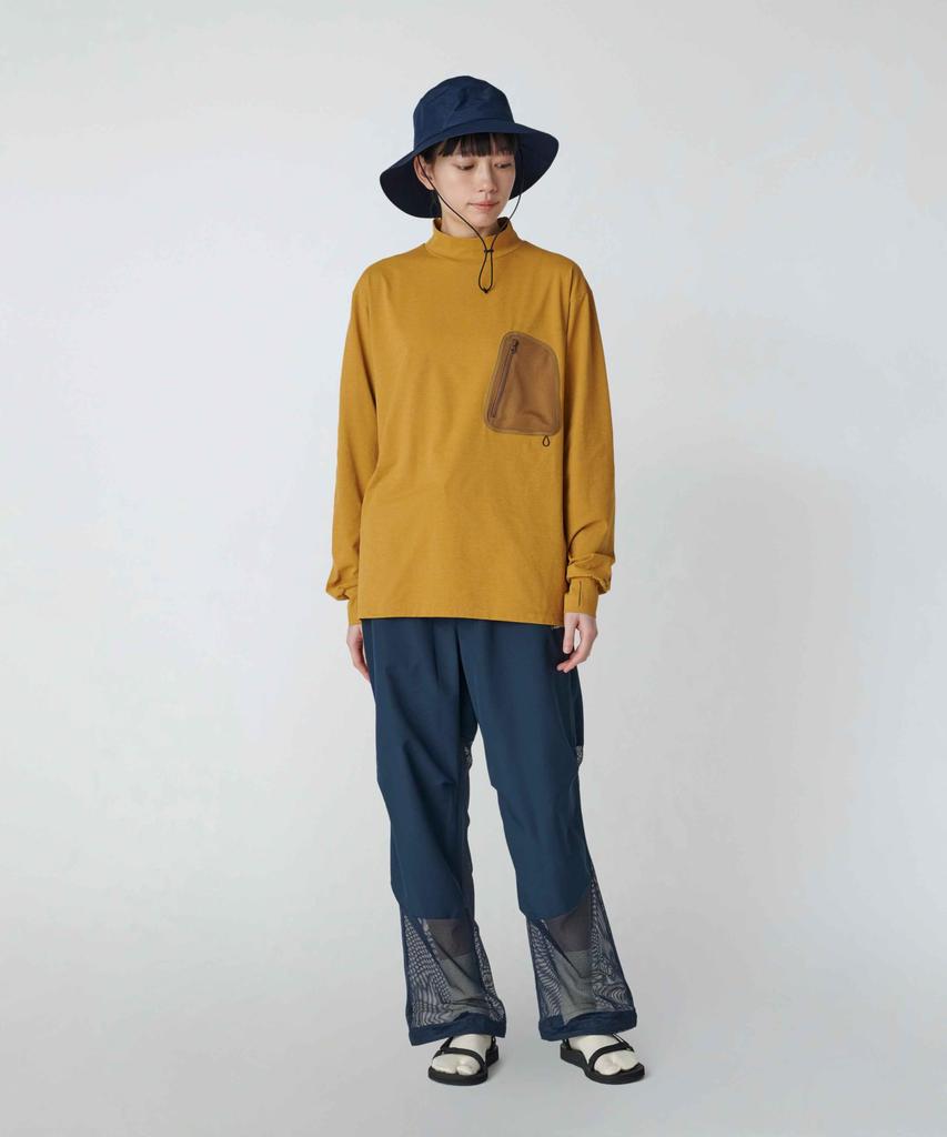 The collection includes apparel and merchandise, available in three colors: black, mustard, and light gray. A wide range of sizes is available to accommodate a wide range of fits, regardless of gender or age. This long-sleeved T-shirt features a mock neck to prevent water from entering the neck. The mock neck protects the neck, while the cuffs with thumbholes protect the backs of the hands. The zippered chest pocket features mesh for water drainage, and there's a sunglasses loop below the pocket. An asterisk logo accents the left cuff.