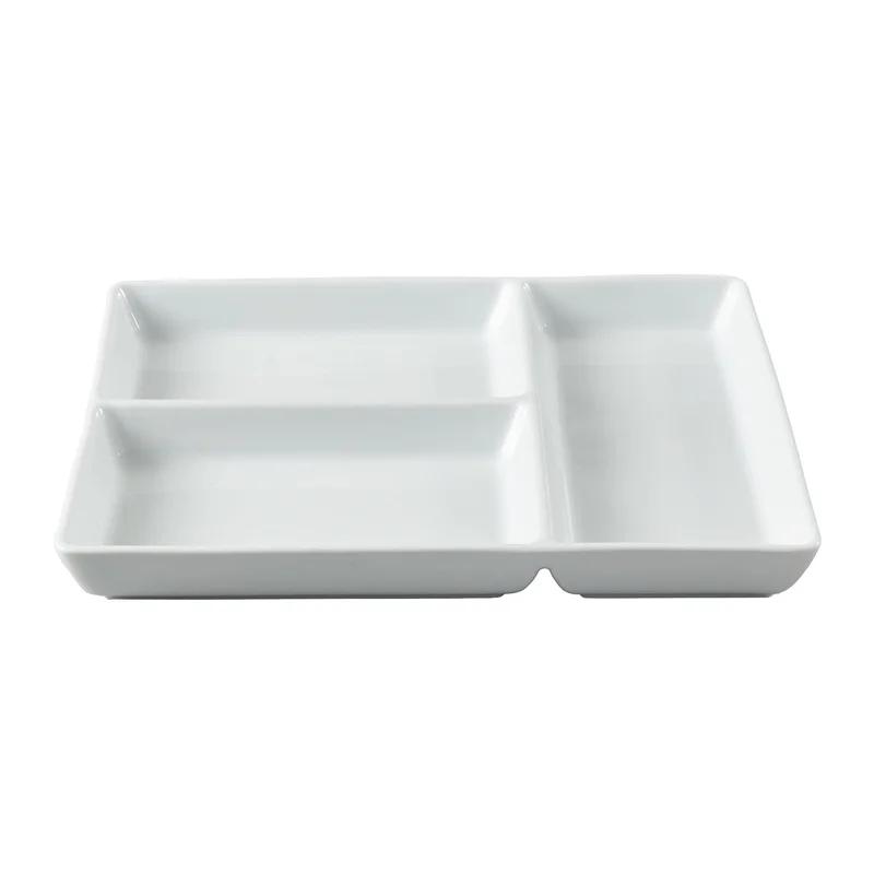 Белый фарфоровый поднос с разделителями. Подходит для использования в микроволновой печи и посудомоечной машине. Прямоугольное сервировочное блюдо. Можно использовать в духовке. Подходит для фруктов, овощей, мяса, сыра.