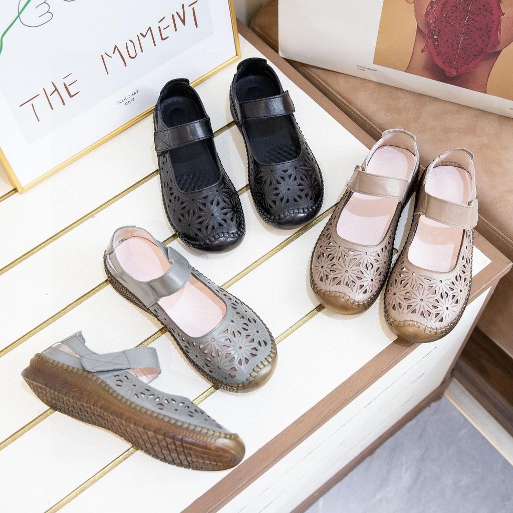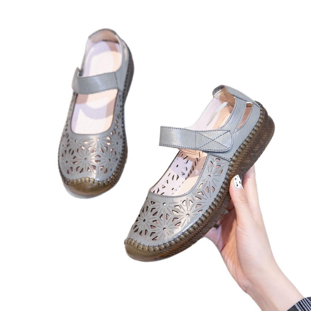 Мамины сандалии женские летние кожаные мягкая подошва для среднего возраста на плоской подошве носить новые туфли с отверстиями женские среднего и пожилого возраста подошва из говяжьей жилы