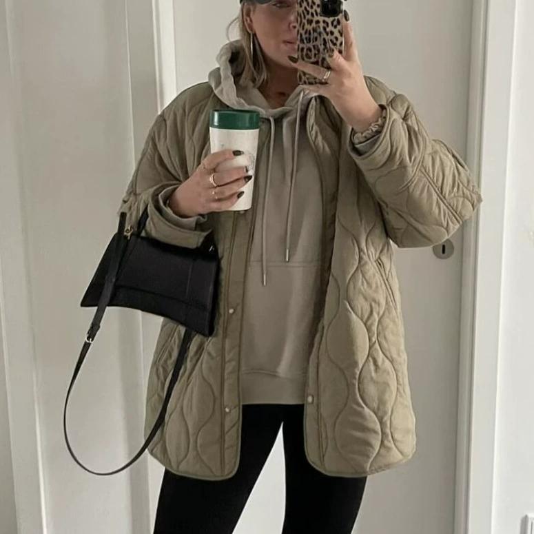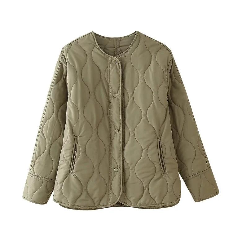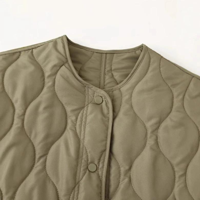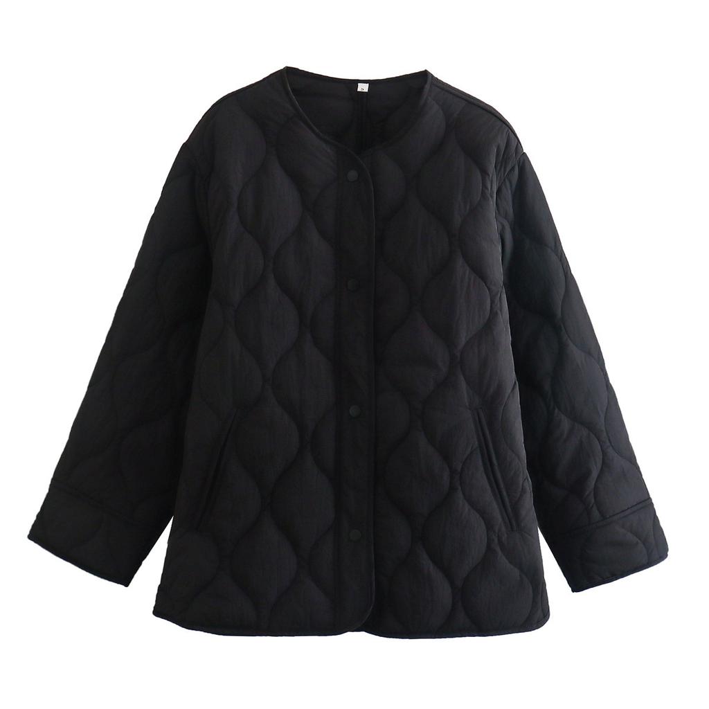 Зимний женский модный темперамент Стеганая ниточная отделка Простой однотонный Круглый вырез Свободная хлопковая куртка с длинным рукавом