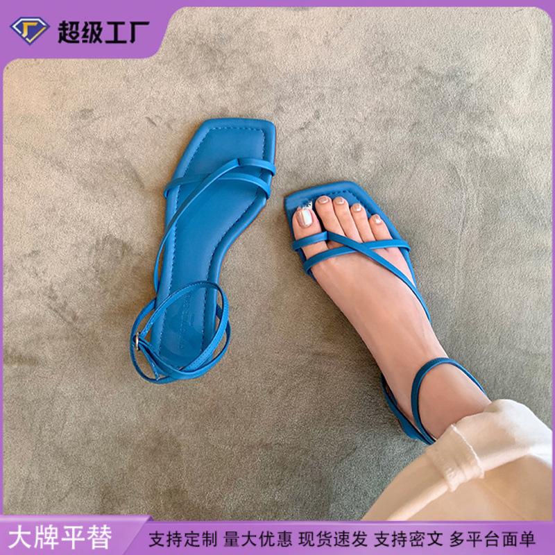 Женская обувь Yuanlitong праздничный стиль~ Корейский стиль блогера квадратный носок перекрестный ремешок закрытый носок сандалии на плоской подошве женские летние