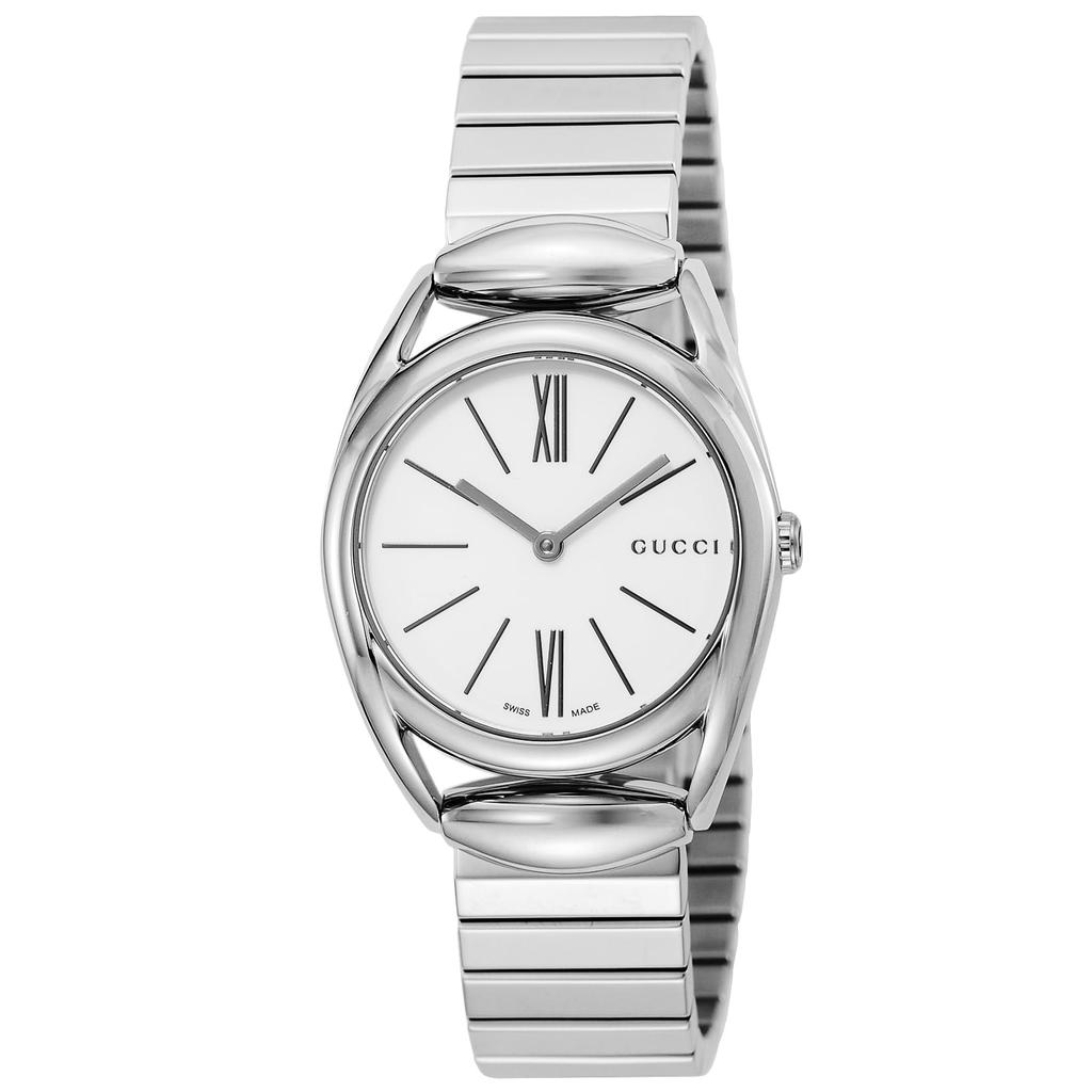 Gucci Часы серебристые из нержавеющей стали с белым циферблатом, сапфировым стеклом и кварцевым механизмом, YA140505, Циферблат, Сталь, Кристалл, Механизм, 30 мм, Женские, — купить товар онлайн с бесплатной доставкой по всему миру!