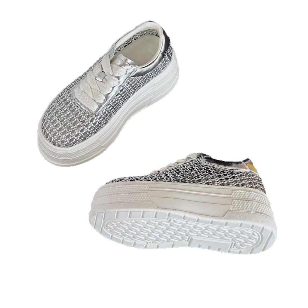 Корейская версия модной повседневной обуви на толстой подошве с полым верхом, женская, лето 2025, новая, из плетеной сетки, белая обувь, универсальные туфли-маффины