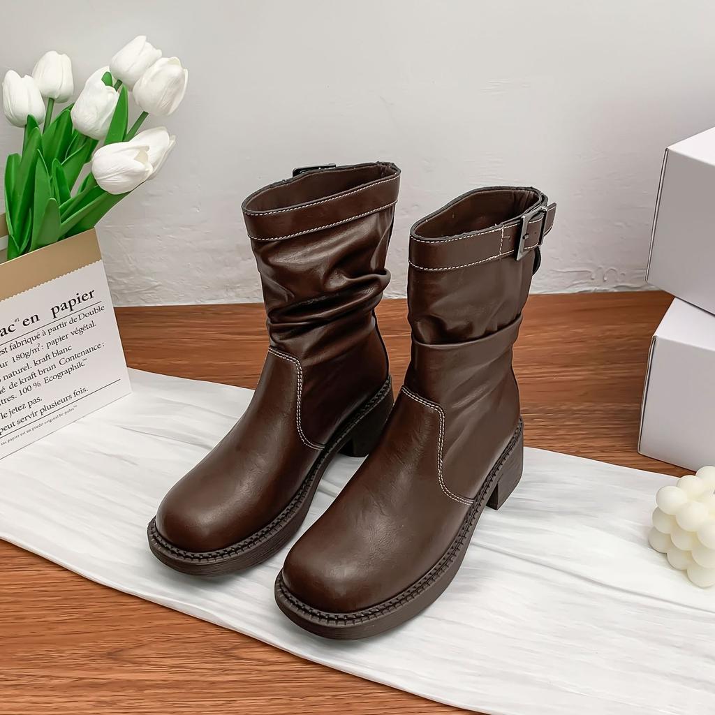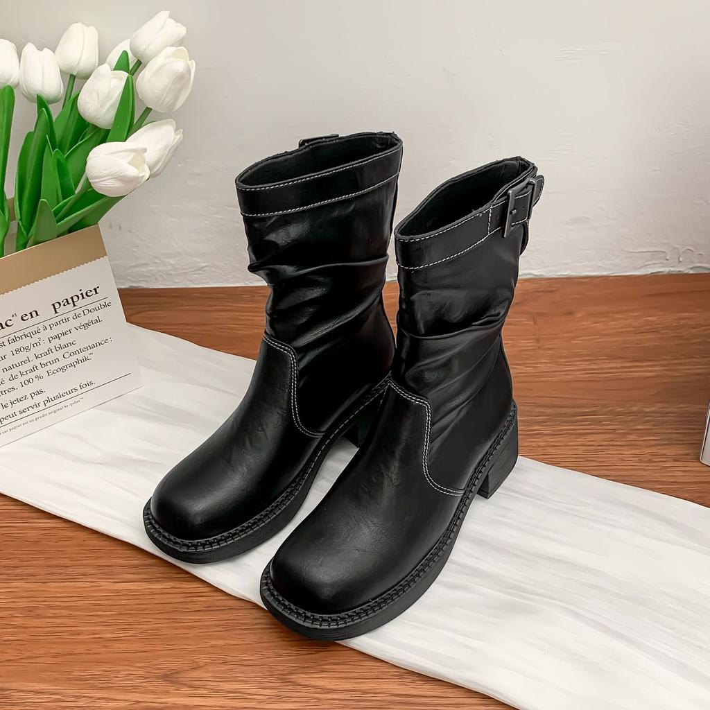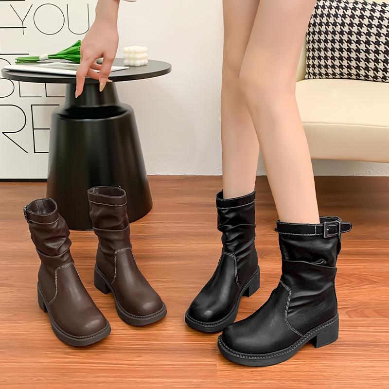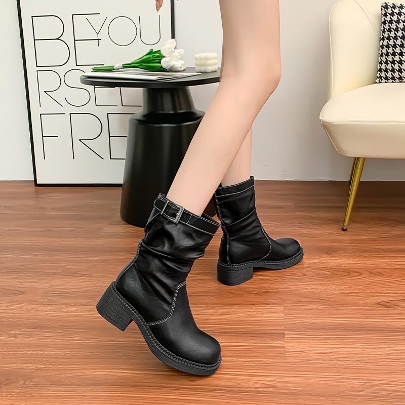 Корейская версия рыцарских ботинок женские с ремешком с пряжкой плиссированные ботинки с напуском удобная мягкая подошва не устают ноги британский стиль на толстой подошве ботинки Мартин