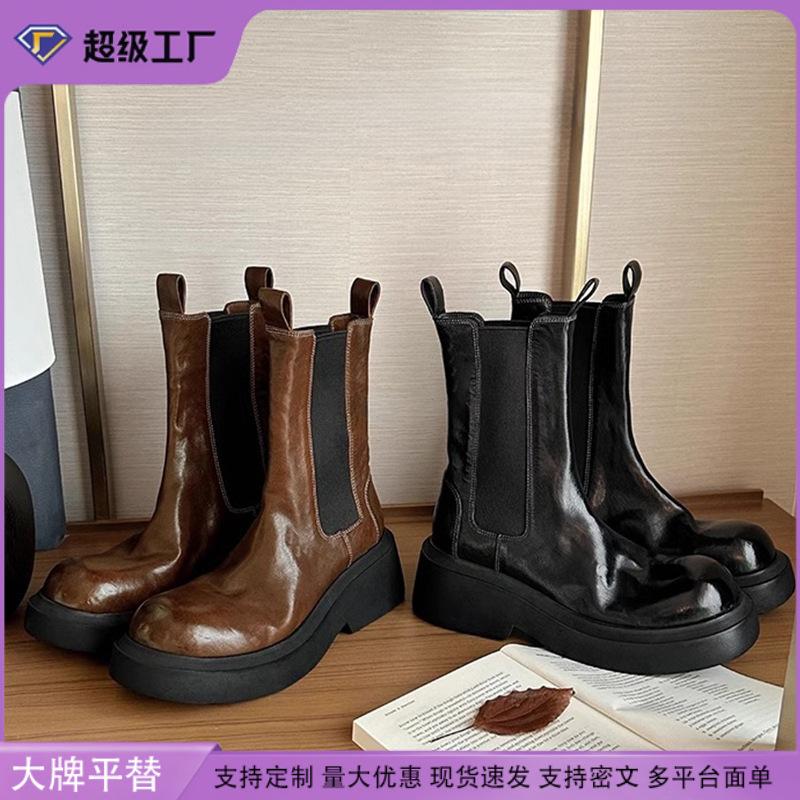 Виноградная Мама Западные Челси Сигаретные Ботинки Женские Ретро Потертые Средней Длины Эластичные Ботинки Маленькие Толстоподошвенные Ботинки на Высокой Платформе