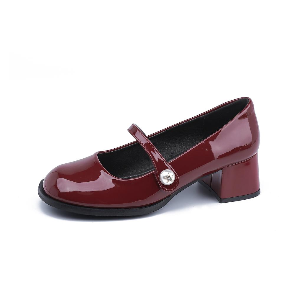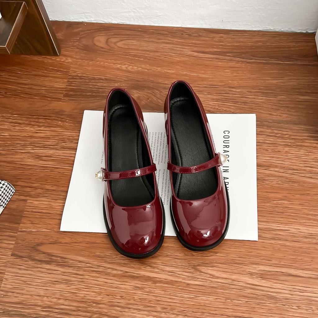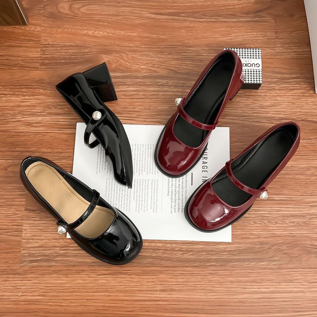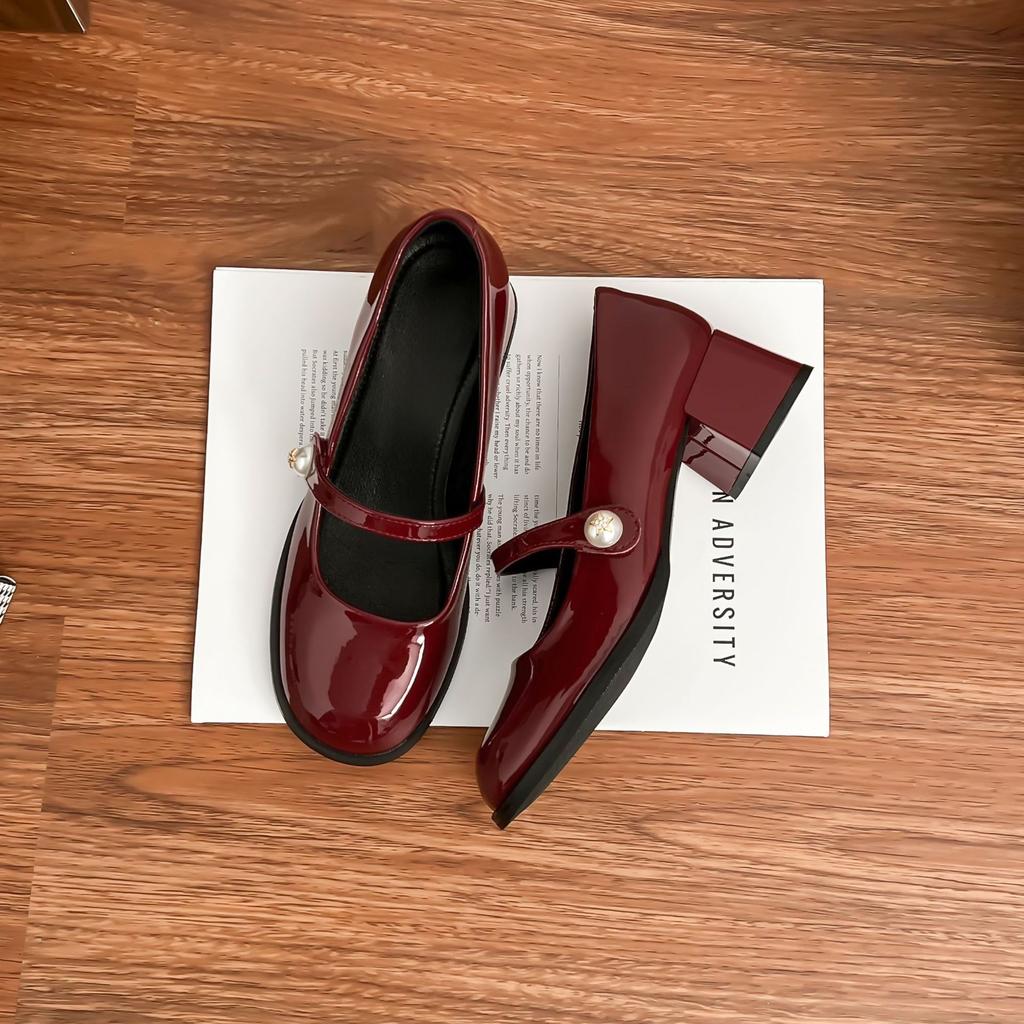 2025 new French Mary Jane shoes women's pearl one-word buckle light mouth thick heel single shoes red high heels women