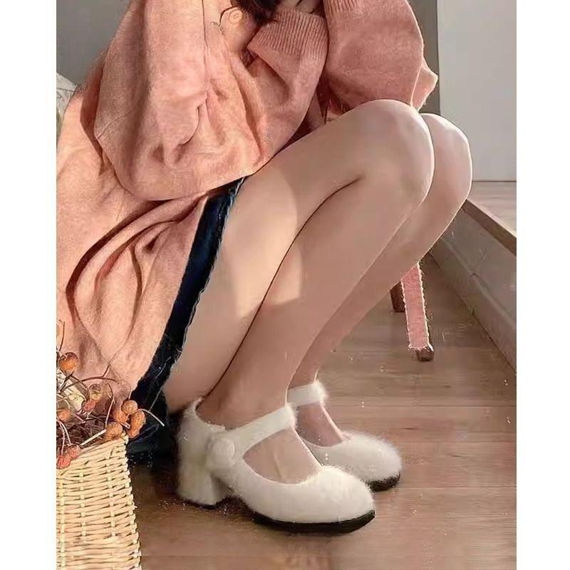 2025 новые туфли на толстом каблуке с пушком, женские, универсальный сказочный стиль Мэри Джейн, высокие каблуки, зимние бархатные одинарные туфли