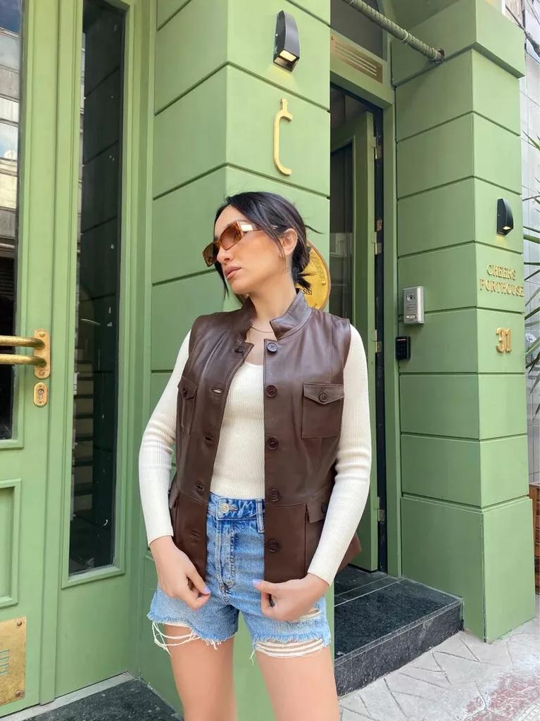 Кожа Овчина Байкер Стильный Вестерн Пуговица Жилет Женский Жилет Пальто Коричневый