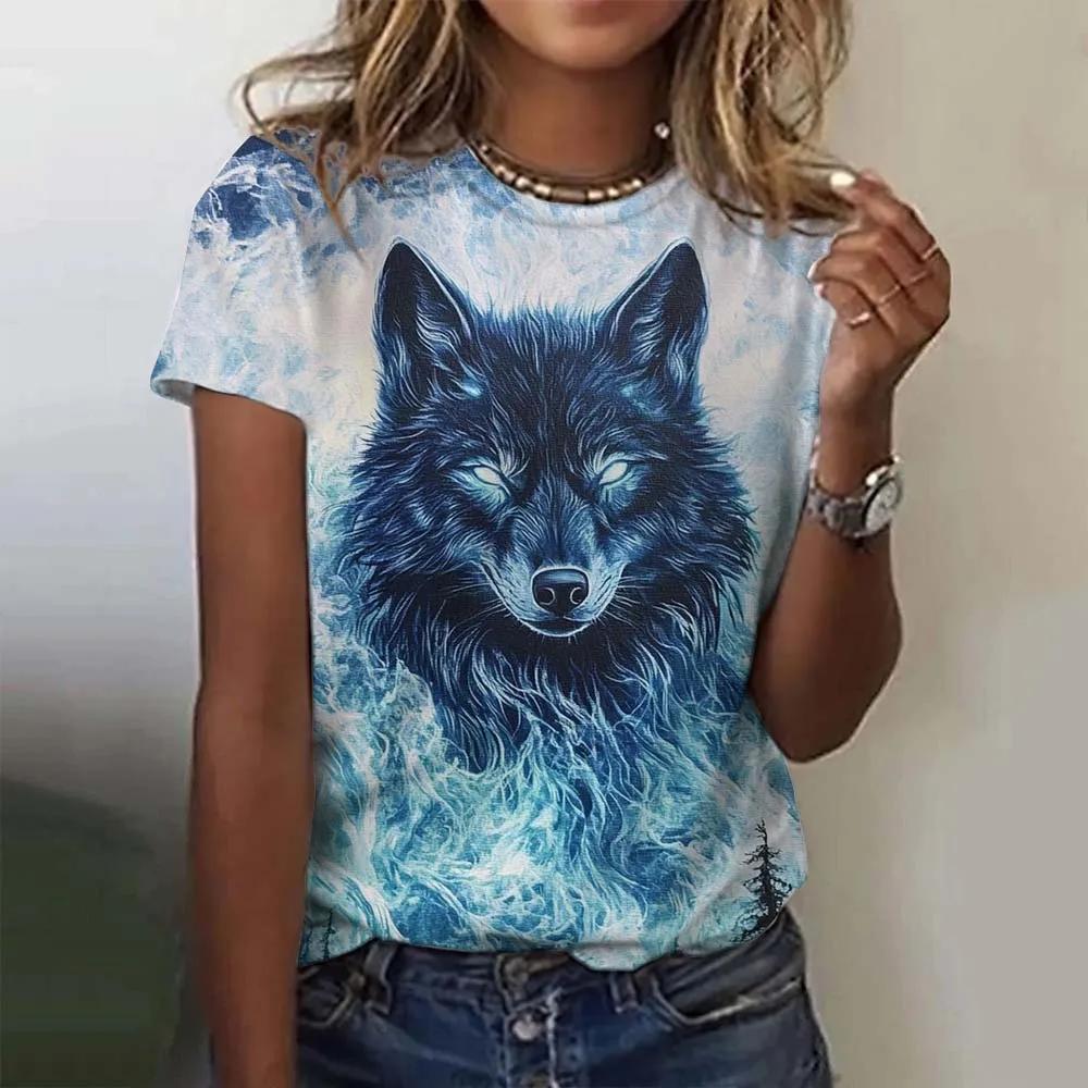 Summer Round Neck 3D Animal Wolf Pattern Print Top Fashionable Casual Short Sleeved Women's T-shirts
