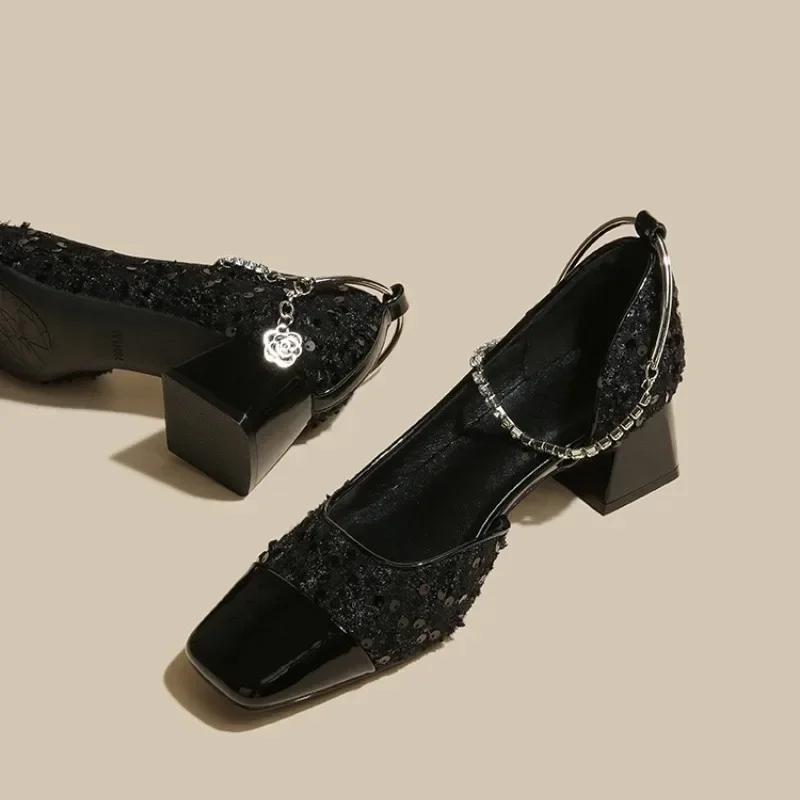 Модные серебристые модные цепочки с пряжкой на щиколотке женские туфли на высоком каблуке элегантные туфли-лодочки с квадратным носком женские туфли с пайетками на массивном каблуке для платья и вечеринки женские