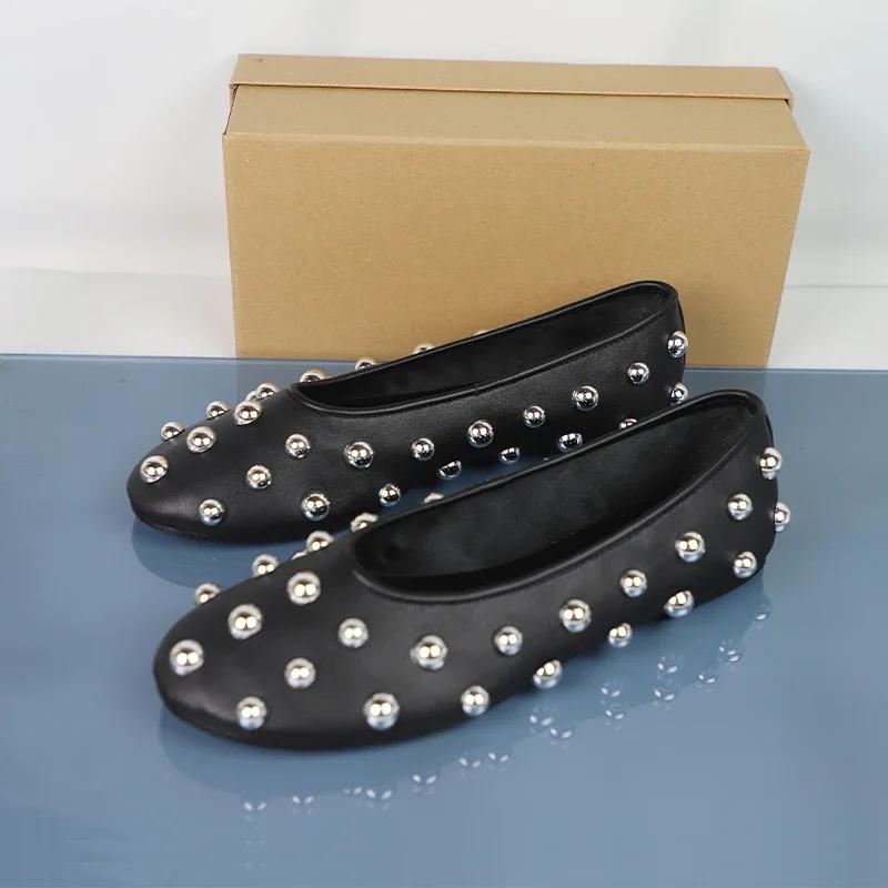 Модный дизайнер Весенняя женская повседневная обувь Черные заклепки Мягкая кожа Винтажная Удобная Неглубокая Уличная Обувь Слипоны Женские Балетки