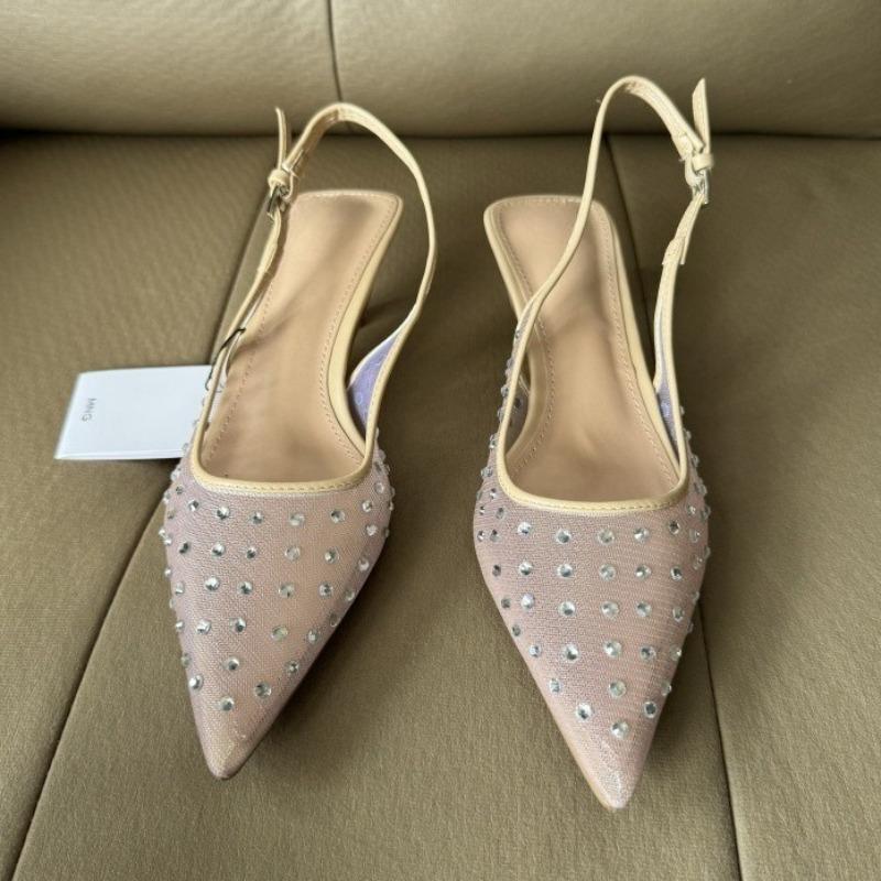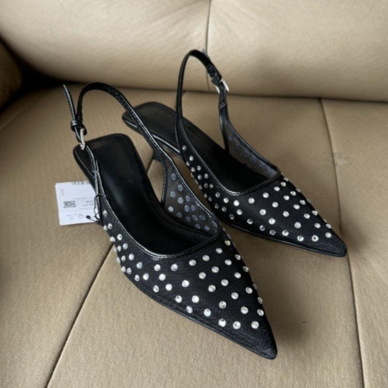 Модные Роскошные Сетки со Стразами Женские Босоножки на Высоком Каблуке 2025 Лето Острый Носок Платье Слингбэки Сексуальные Офисные Рабочие Женские Туфли-Мюли