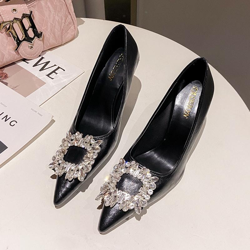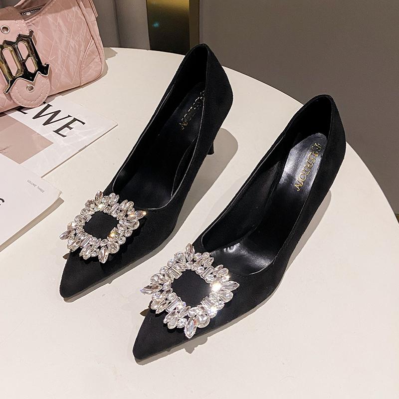 Модная женская обувь Модные туфли для подружки невесты на свадьбу с квадратной пряжкой со стразами Однотонные замшевые туфли-лодочки на шпильке с острым носком Французские туфли на высоком каблуке