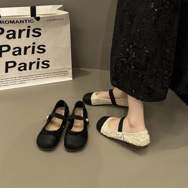 Модная женская обувь на плоской подошве черного цвета с круглым носком и пайетками, женская обувь на низком каблуке, элегантная, слипоны, модная летняя обувь 2025 года в популярном корейском стиле