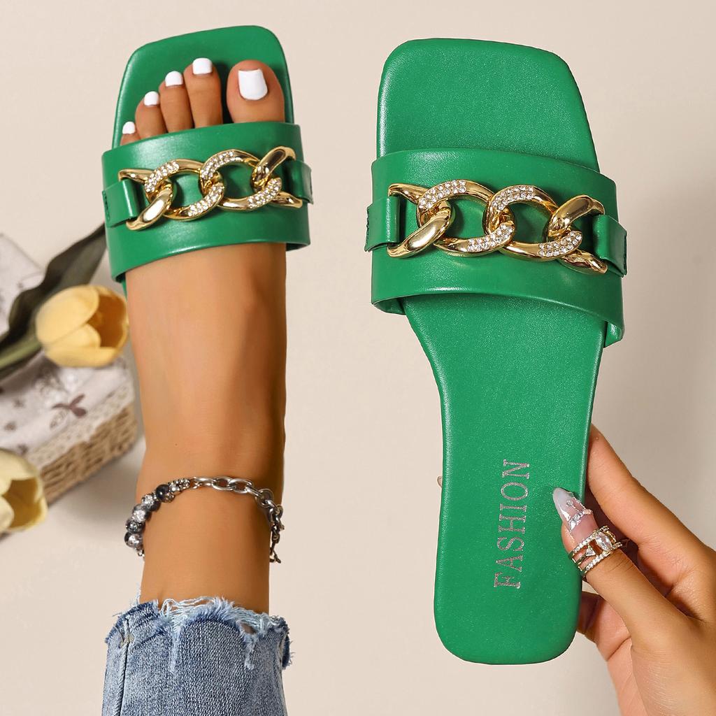 Мода Мода Женские тапочки Квадратный носок Цепочка Тапочки 2025 Новые Плоские Пляжные сандалии Металлическая отделка Повседневная обувь Домашние шлепанцы Женские