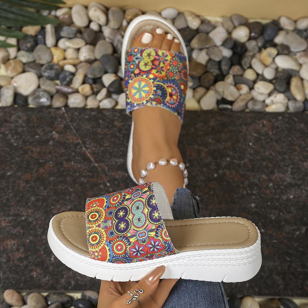 Модные женские тапочки, красочные сандалии на платформе с этническим узором, летняя удобная пляжная обувь, женские тапочки на танкетке, шлепанцы женские