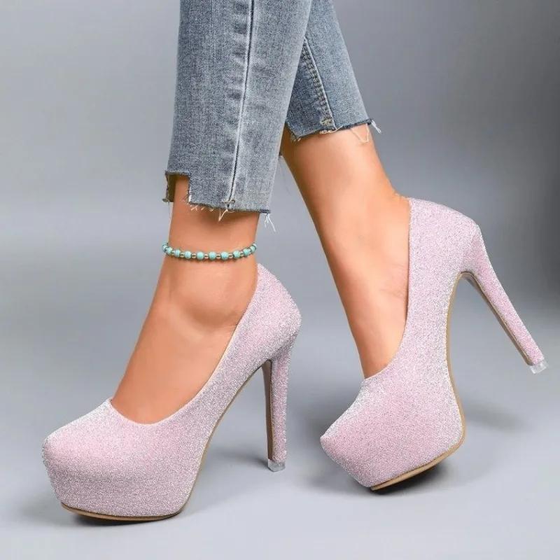 Мода 2025 Новая женская обувь Неглубокие женские туфли на высоком каблуке Модные туфли с круглым носком Большого размера Банкет Бестселлер Сексуальная супервысокая обувь для женщин