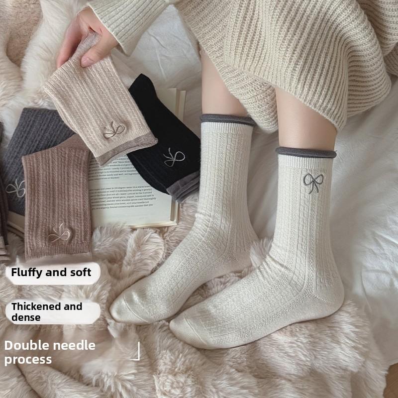 Женские осенне-зимние вышитые носки-гольфы с бантиком и закрученным краем, сочетающихся цветов, дышащие, впитывающие пот