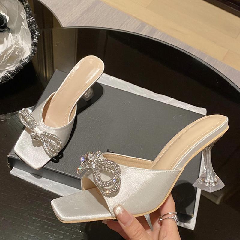 Модные Liyke Подиумный Стиль Блестящие Стразы Женские Прозрачные Странные Высокие Каблуки Шлепанцы Кристальный Бант Сатиновые Летние Сандалии Обувь