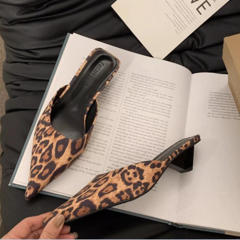 Модные женские тапочки с острым носком, леопардовый узор, неглубокие туфли без застежек, на тонком низком каблуке, черные флоковые узоры, повседневные мюли, черные уличные туфли