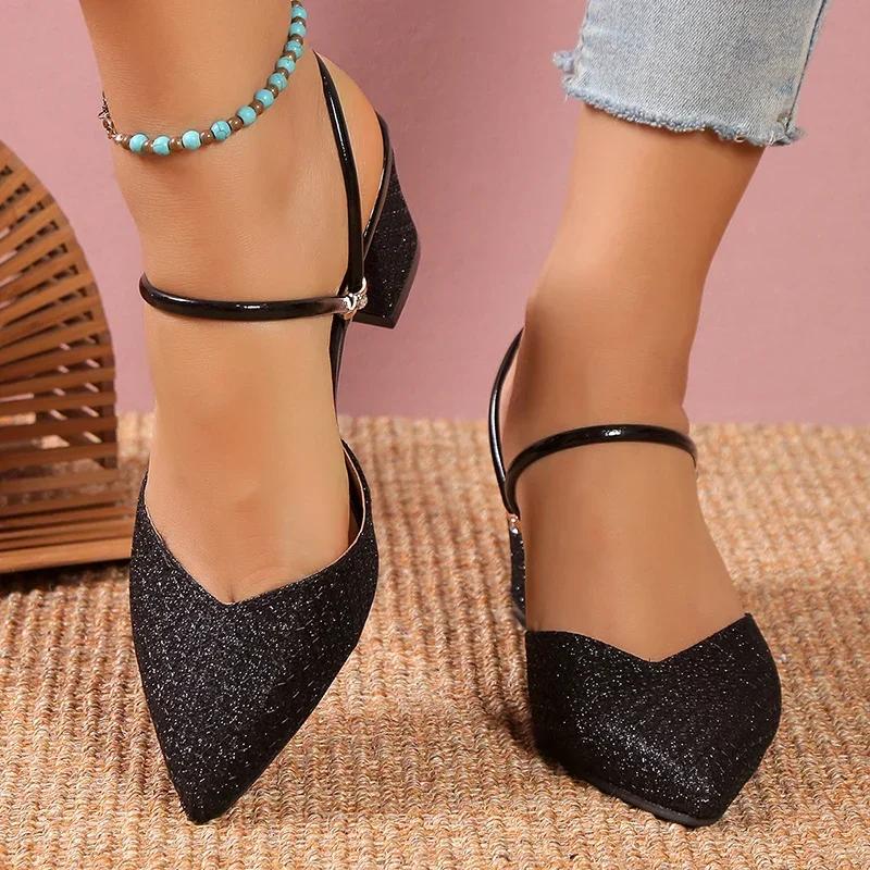 Модные золотые серебристые блестящие туфли-лодочки на высоком каблуке, женские модные туфли на ремешке сзади, слипоны для вечеринки, женские туфли-слингбэки с острым носком, туфли на толстом каблуке