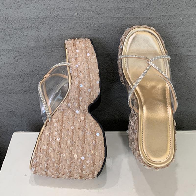 Fashion Liyke Summer Wedges Shoes For Women Platform Slippers Fashion Crystal Rhinestone High Heels Square Toe PVC Transparent Sandals