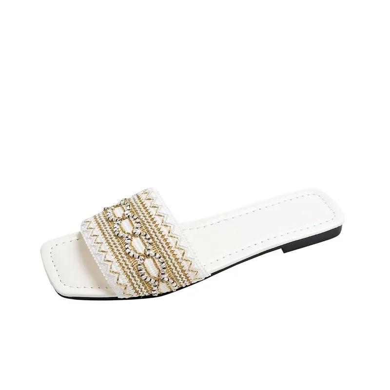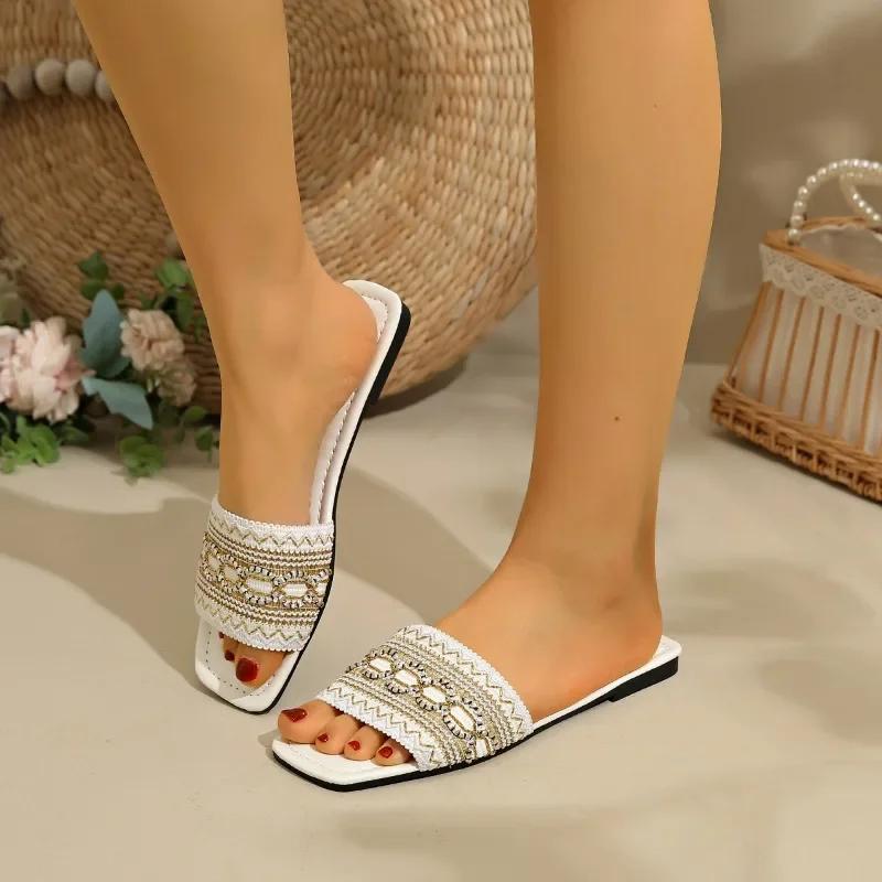 Модная женская обувь 2025 Шлепанцы с открытым носком Женские больших размеров Повседневные Удобные Сандалии смешанных цветов Квадратный носок Шлепанцы с плоской подошвой и бусинами на ремешке