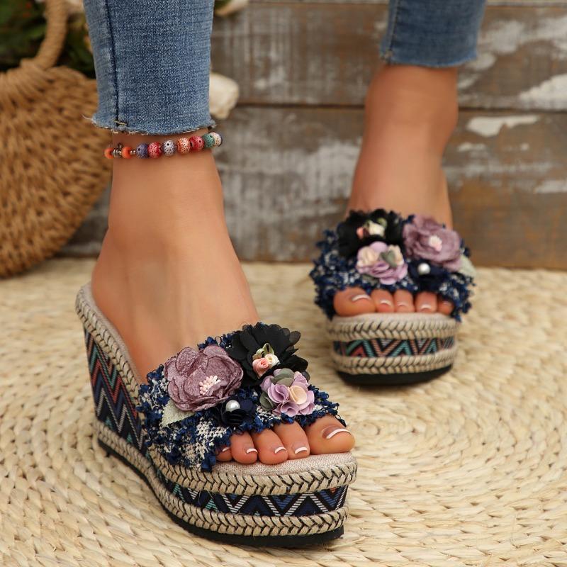 Мода 2025 Женские босоножки с открытым носком на танкетке для женщин Летняя мода Цветочное украшение Массивная платформа Толстая подошва обувь