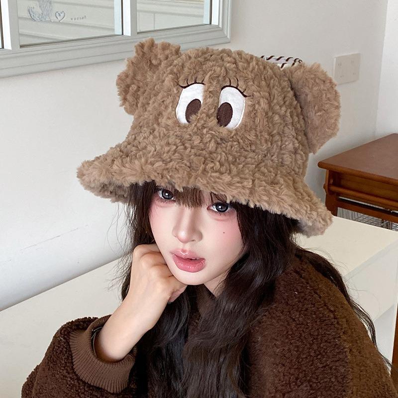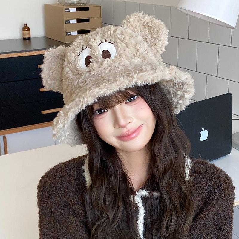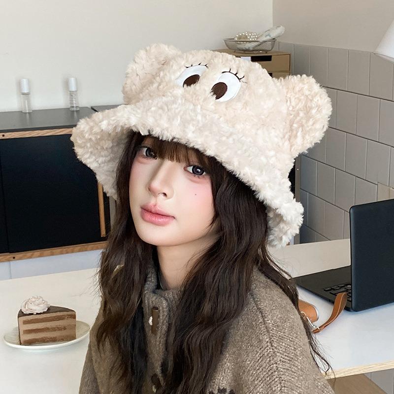 Cute funny big eyes plush hat women autumn and winter thickened thermal basin hat big head circumference cartoon couple bucket hat