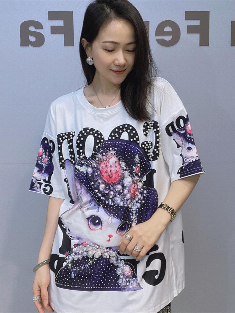 Модные футболки с принтом для женщин Летняя одежда Повседневный 3D мультяшный узор Горячие бриллианты Бисероплетение Женские топы с коротким рукавом Футболка