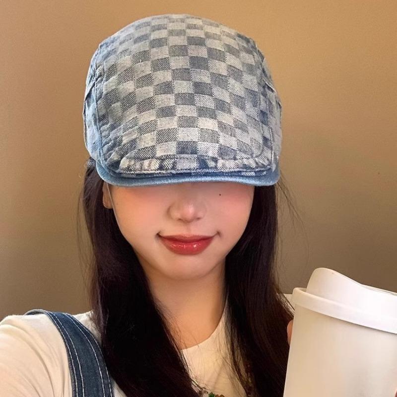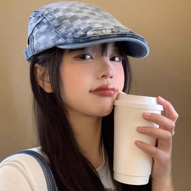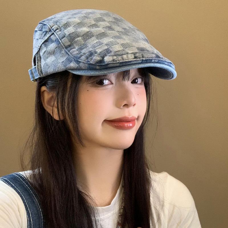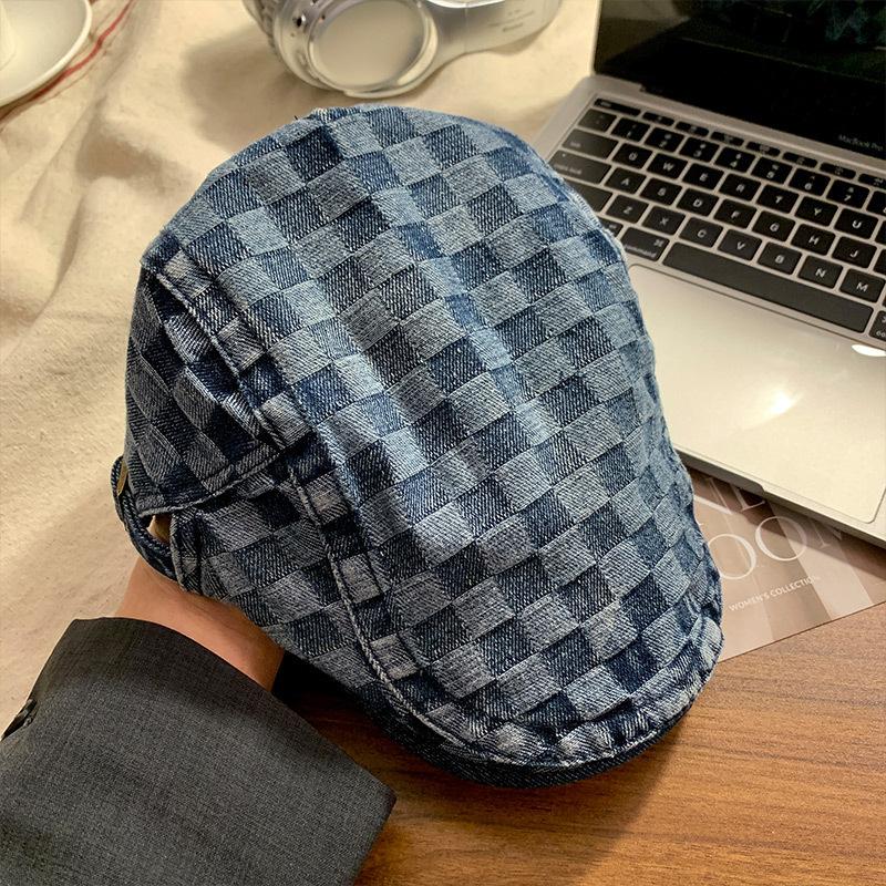Клетчатый джинсовый берет-кепка женский с обратным ношением, вываренный ретро, большой окружности головы, шляпа художника, весенне-осенний женский