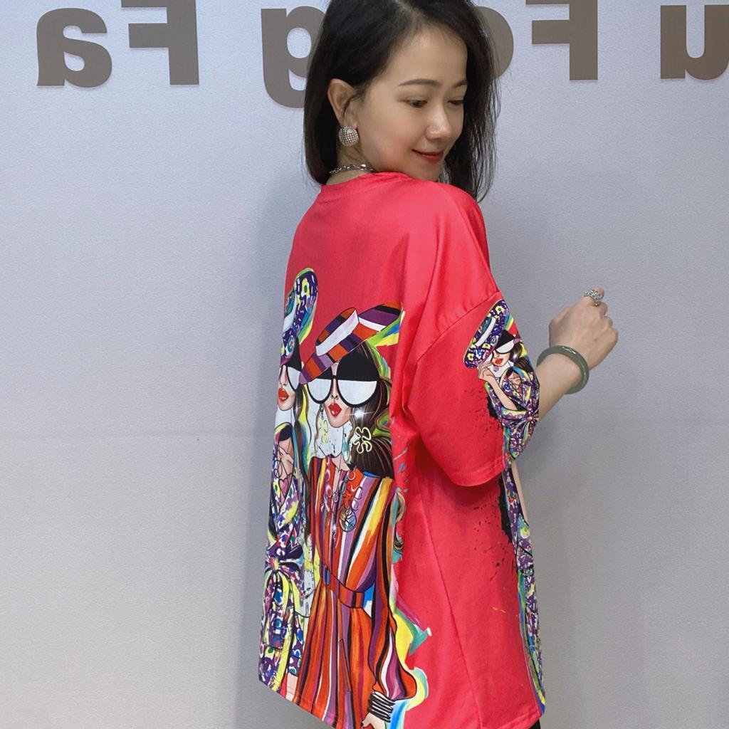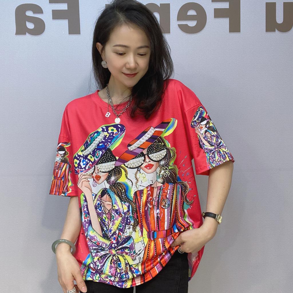 Большие размеры, цветные футболки с принтом в виде ромбов и бисером для женщин, летняя тонкая одежда, с круглым вырезом, с коротким рукавом, повседневные свободные футболки