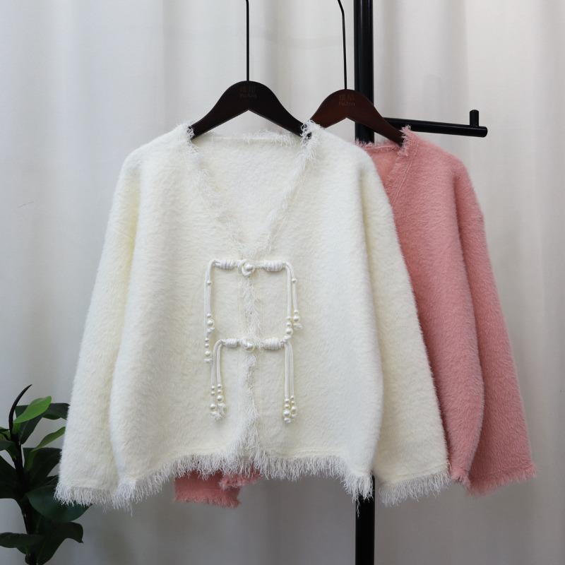 Осень-зима 2025 новый кардиган из вязаного имитационного норкового бархата с китайской жемчужной застежкой-пуговицей, маленькая ароматная куртка-свитер с бахромой, тренд