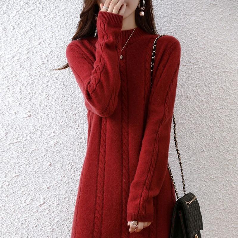 Осенне-зимняя утолщенная юбка-свитер средней длины с узором «витая коса», свободная и облегающая, женское трикотажное платье с полувысоким воротником