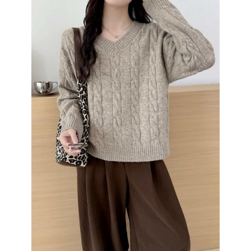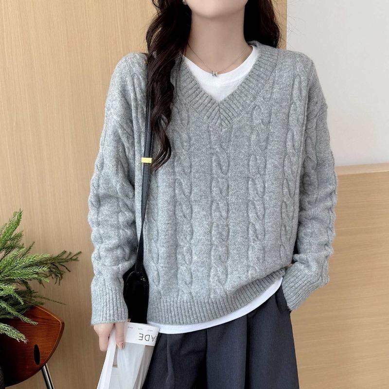 Осень и зима новый ретро свитер женский свободный и простой ветер твист пуловер V-образный вырез длинный рукав маленький базовый вязаный свитер