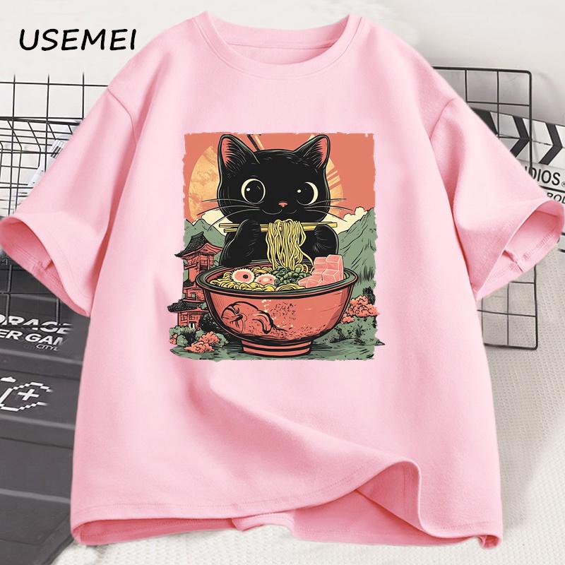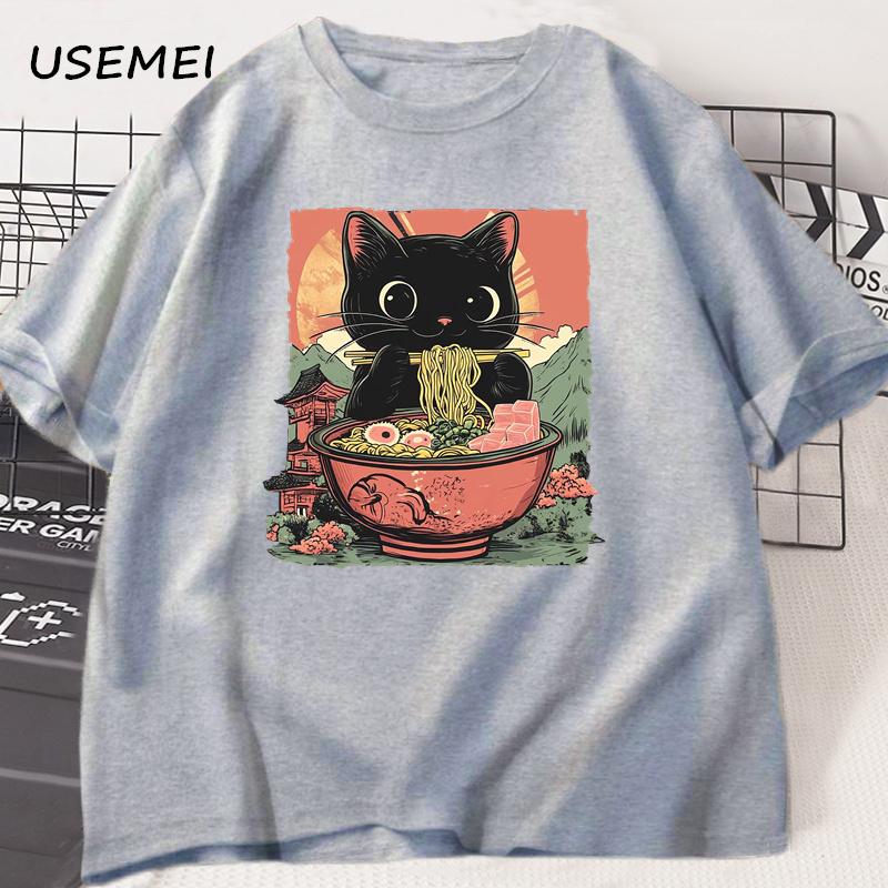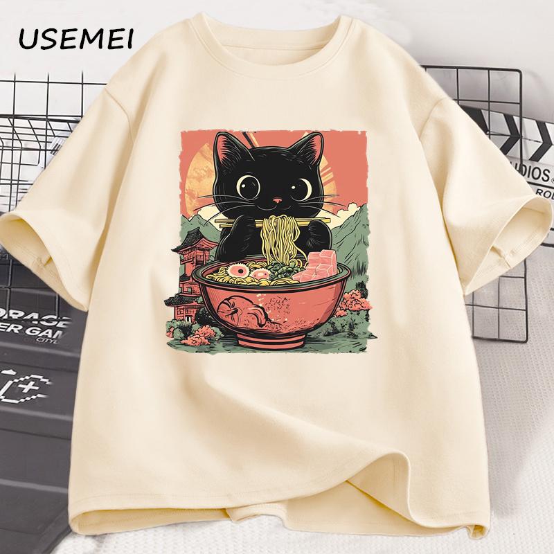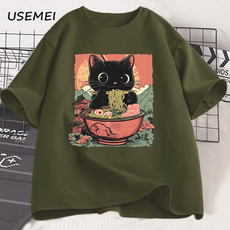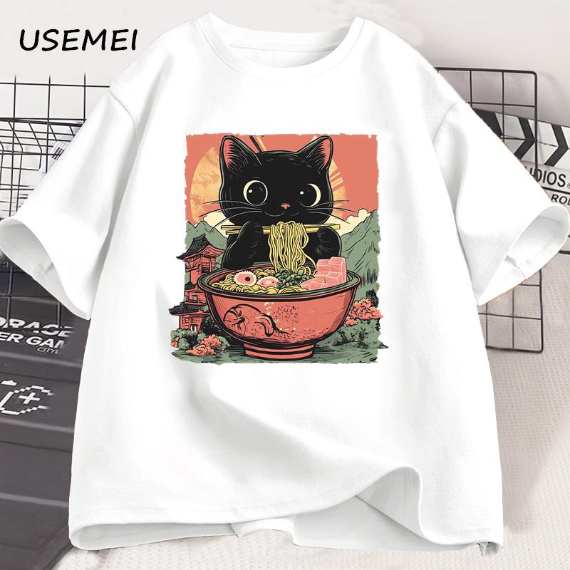 Милая футболка с черным котом, поедающим рамен, для мужчин и женщин, очаровательная графическая футболка, футболка для гурмана и любителя кошек, футболка с принтом животного, топ