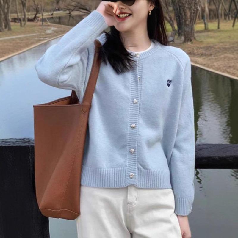 Осень и зима однотонный вышитый переднее плечо длинный рукав вязаный кардиган женский свободный короткий верхний свитер-жакет