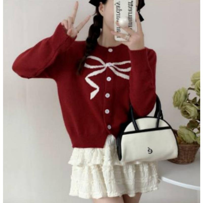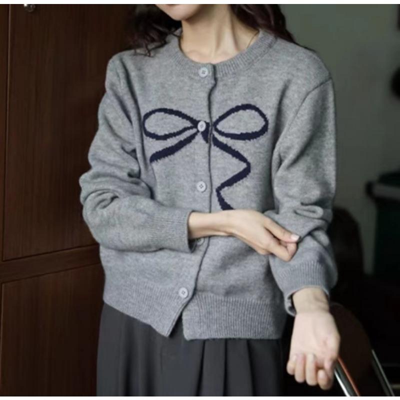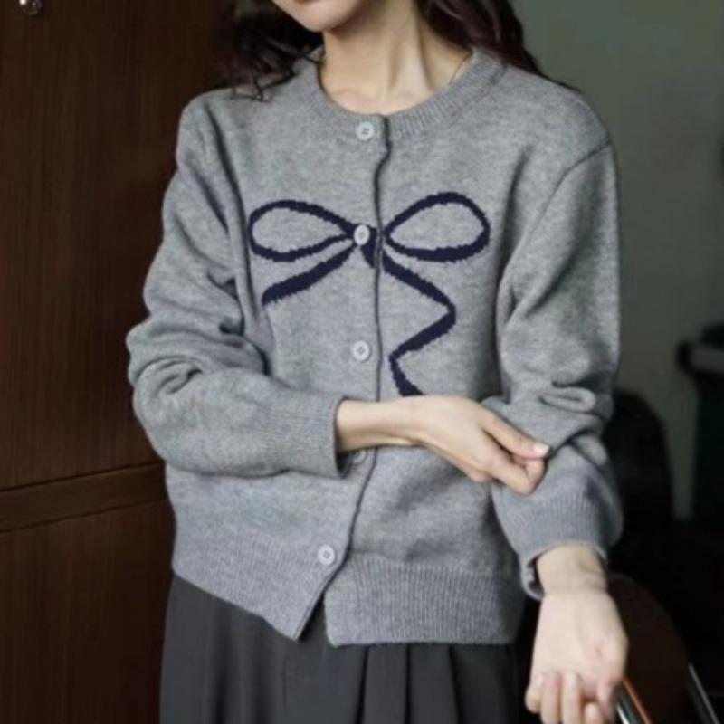 Новый однотонный милый пуловер жаккардовой вязки с круглым вырезом и бантом, уменьшающий возраст, женский кардиган