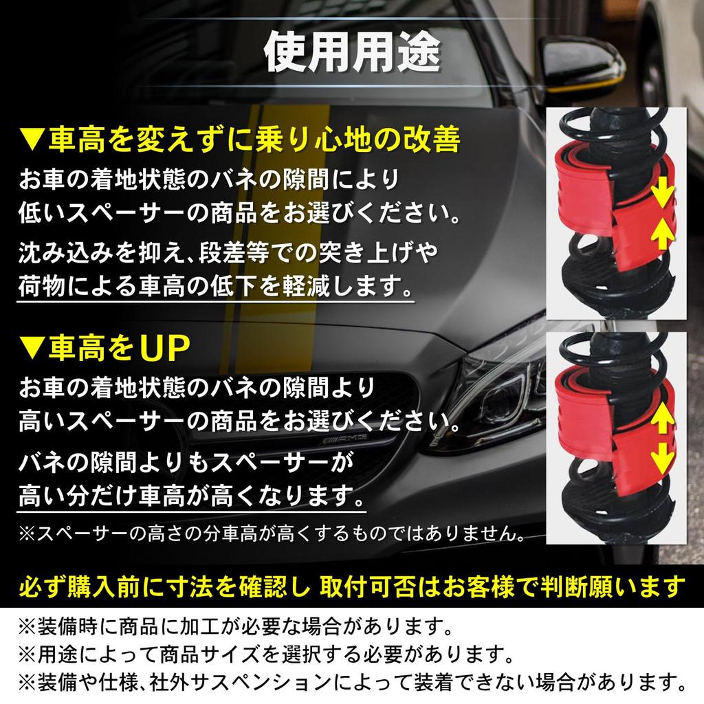 Описание товара: Это универсальный набор из 2 резиновых проставок для широкого спектра автомобилей, включая Toyota, Honda, Nissan, Suzuki, Daihatsu, Mazda и т.д.. Предотвращает ненужную просадку автомобиля и предотвращает излишние проставки из подвесочной резины внизу. Плавная передача мощности создает удивительные изменения в управляемости.. Его можно легко установить как спереди, так и сзади, если подобрать размер.