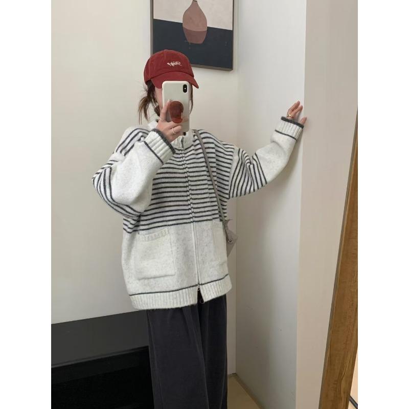 Осень и зима новый полосатый вязаный свитер женский кардиган новый свободный ленивый ветер контрастный цвет свитер куртка
