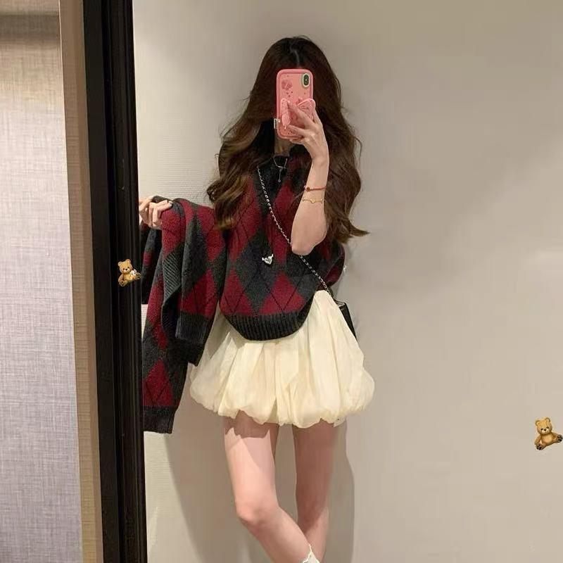 Женский вязаный костюм с ромбами контрастного цвета, новинка осени и зимы, однобортный кардиган-жакет, пуловер, жилет, комплект из двух предметов для женщин