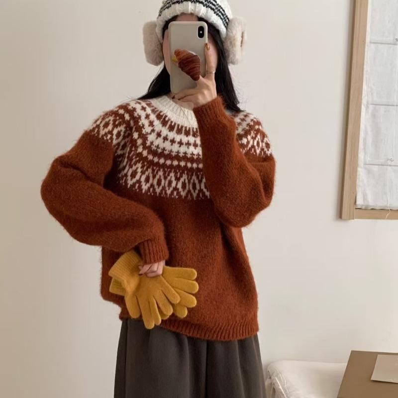 Винтажный универсальный вязаный пуловер Fair Isle женский осенне-зимний мягкий восковой свободный ленивый рождественский вязаный свитер топ женский