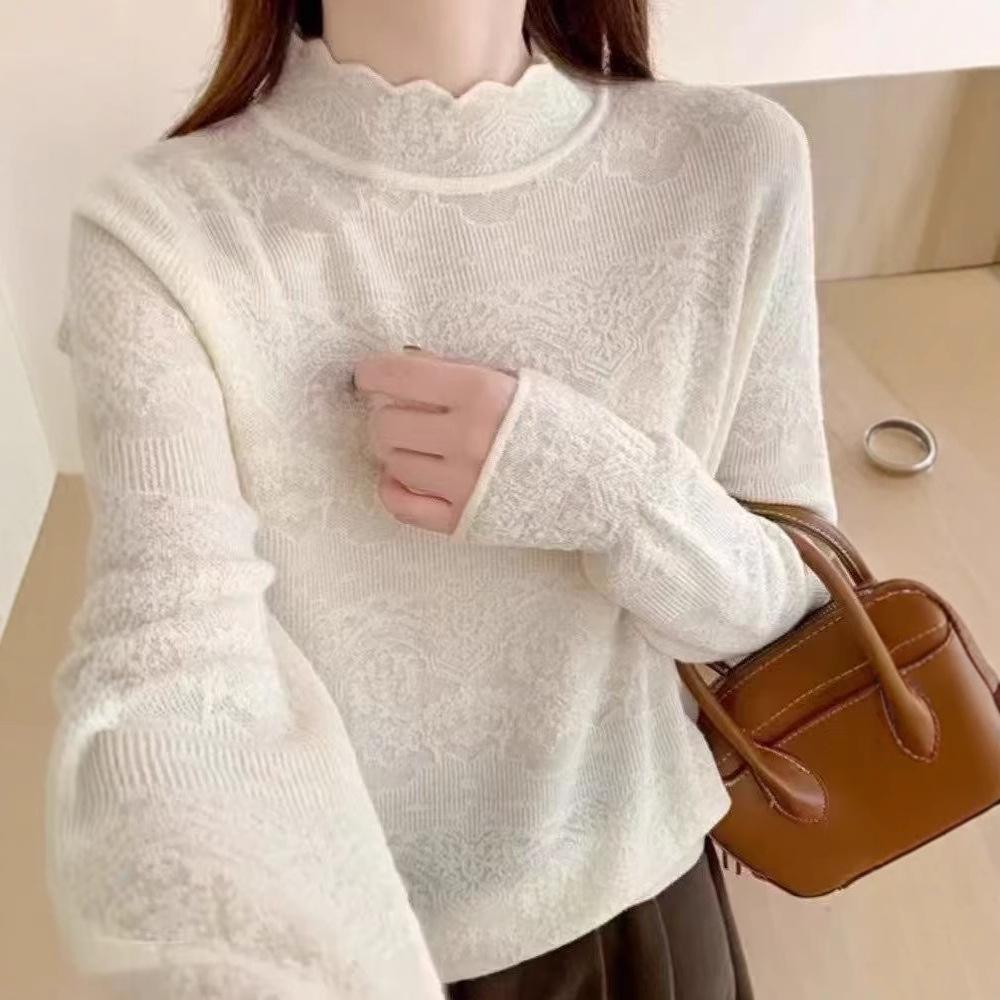 Кружевной трикотажный базовый топ с полувысоким воротником для женщин, осенне-зимний новый универсальный свитер, жаккардовый топ для женщин