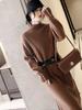 Вязаное платье женское осенне-зимнее рукава-фонарики темперамент светская львица новинка пояс на талии полувысокое горло свитер длинное платье
