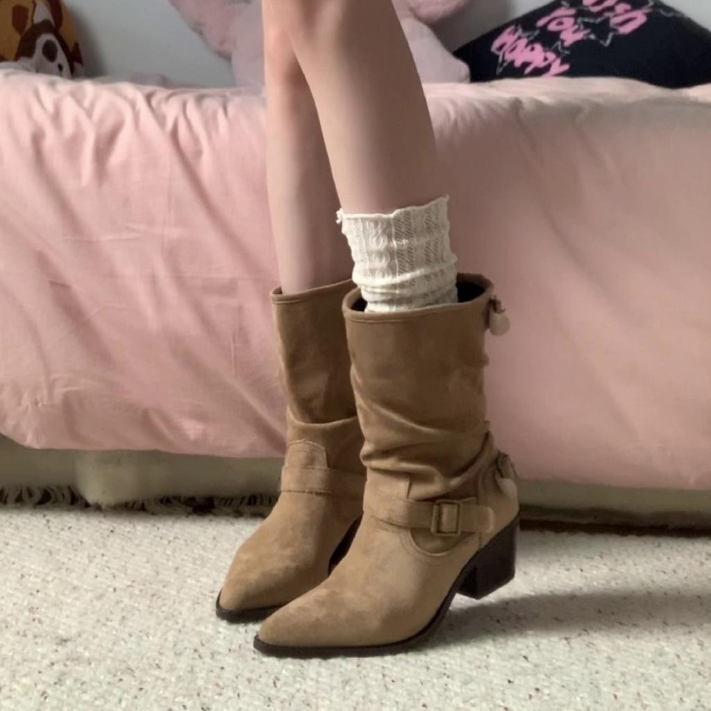 Мода Новый Стиль Модные Сапоги Женские Остроносые Ковбойские Толстый Каблук Наборные Сапоги Новый Стиль Без Колена Широкое Голенище Жиру Женские Сапоги